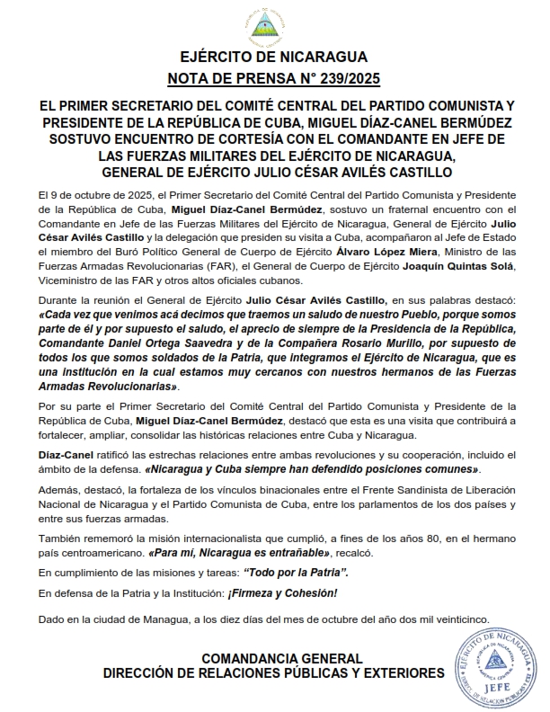 El 9 de octubre de 2025, el Primer Secretario del Comité Central del Partido Comunista y Presidente de la República de Cuba, Miguel Díaz-Canel Bermúdez, sostuvo un fraternal encuentro con el Comandante en Jefe de las Fuerzas Militares del Ejército de Nicaragua, General de Ejército Julio César Avilés Castillo y la delegación que presiden su visita a Cuba, acompañaron al Jefe de Estado el miembro del Buró Político General de Cuerpo de Ejército Álvaro López Miera, Ministro de las Fuerzas Armadas Revolucionarias (FAR), el General de Cuerpo de Ejército Joaquín Quintas Solá, Viceministro de las FAR y otros altos oficiales cubanos.
