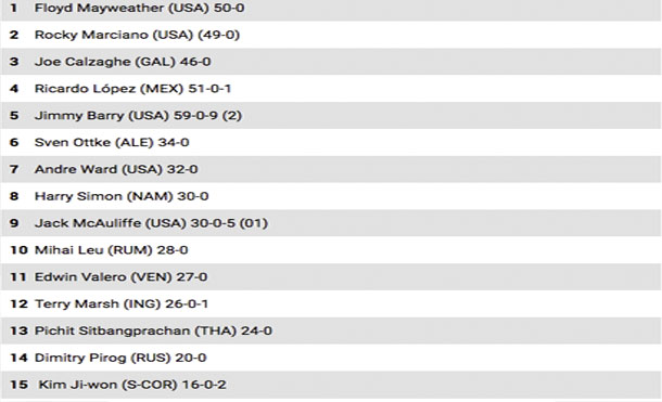 En el mundo del boxeo, se han dado algunos casos, además de los de Floyd y Marciano, de profesionales que fueron campeones mundiales y acabaron en su casillero con cero derrotas, como son los del mexicano Ricardo ‘Finito’ López (51-1 nulo), el galés Joe Calzaghe (46-0), el venezolano Edwin Valero (27-0) o el irlandés americano Jimmy Barry (59-9 nulos- 2 sin decisión).