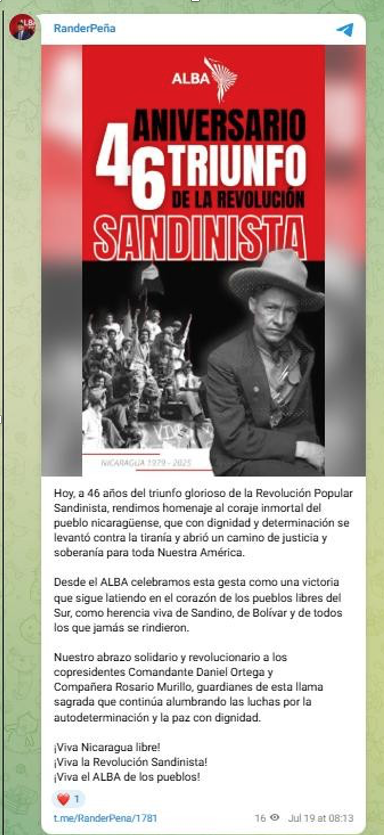 VENEZUELA / A 46 años del triunfo glorioso de la Revolución Popular Sandinista, el Secretario Ejecutivo del ALBA-TCP, Rander Peña, rindió homenaje al coraje inmortal del pueblo nicaragüense, destacando su lucha contra la tiranía y su ejemplo de dignidad y soberanía para toda Nuestra América.