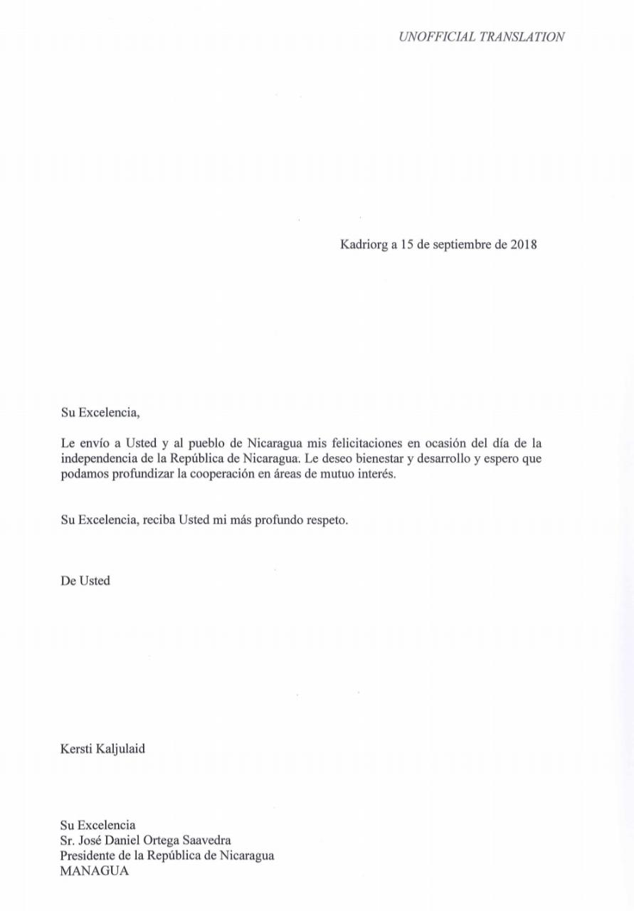 La Compañera Rosario destacó que desde Estonia nos escribe la Presidenta Kersti Kaljulaid, “enviando al pueblo de Nicaragua y al Presidente Ortega en ocasión del Día de la Independencia de Nicaragua y deseando bienestar y desarrollo, esperando poder profundizar la cooperación en áreas de interés mutuo”.