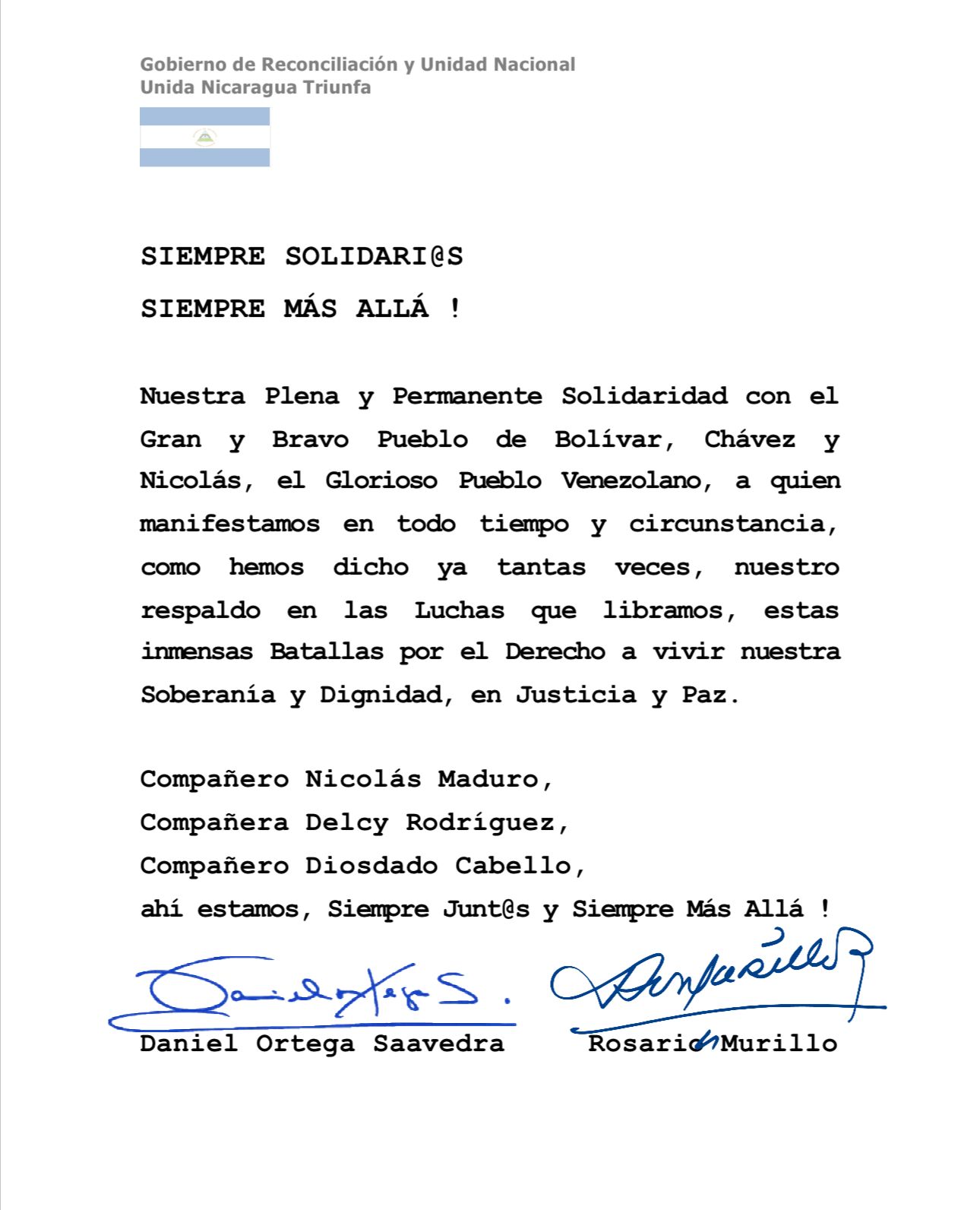 MANAGUA – NICARAGUA / El Gobierno de Nicaragua envió este sábado 29 de noviembre, un mensaje de hermandad y apoyo solidario al Pueblo y Hermano de la República Bolivariana de Venezuela y a su Presidente Constitucional Compañero Nicolás Maduro Moros, tras el nuevo enfrentamiento agresiva e injerencista imperial por parte del Gobierno de los Estados Unidos de América.