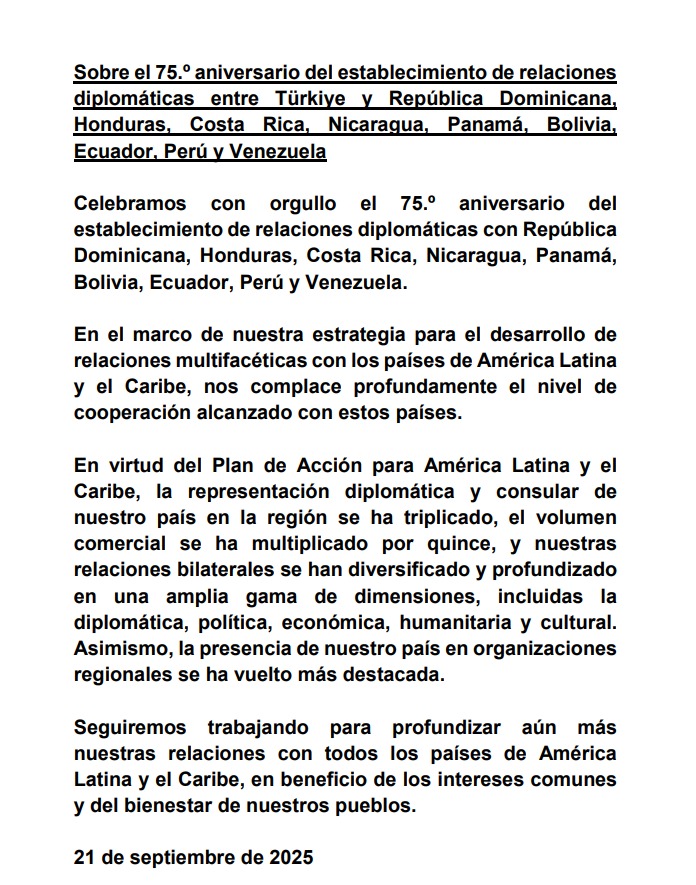 TURKIYE / El Ministerio de Asuntos Exteriores de la República de Turkiye emitió declaraciones de celebración sobre el 75 aniversario del establecimiento de relaciones diplomáticas entre países de América Latina y el Caribe como son República Dominicana, Honduras, Costa Rica, Nicaragua, Panamá, Bolivia, Ecuador, Perú y Venezuela.