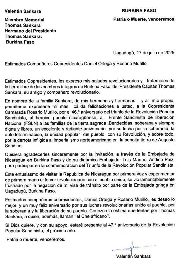 En nombre de la familia Sankara, de mis hermanos y hermanas , y al mío propio, permiteme expresarle mi mas cálida felicitaciones a usted, a la Copresidenta Camarada Rosario Murillo, por el 46.° aniversario del triunfo de la Revolución Popular Sandinista, al heroico pueblo nicaragüense, al Frente Sandinista de liberación Nacional (FSLN),a las familias de la tierra sagrada ,Bendecidas, soberana y siempre digna y libres, un excelente y radiante aniversario por su lucha por la soberanía, la autodeterminación, la unidad popular del pueblo con su Revolución, y sobre todo, por la derrota infligida al imperialismo norteamericano en la bendita tierra de Augusto Sandino.