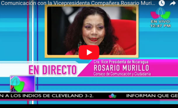 Videos (+Video) Comunicación con la Vicepresidenta Compañera Rosario Murillo, 06 de Abril 2018 viernes 06 abril de 2018miércoles 28 septiembre de 2022 Redaccion Web Twittear Esta entrada fue modificada por última vez el 28 de septiembre de 2022 a las 1:26 PM Redaccion Web